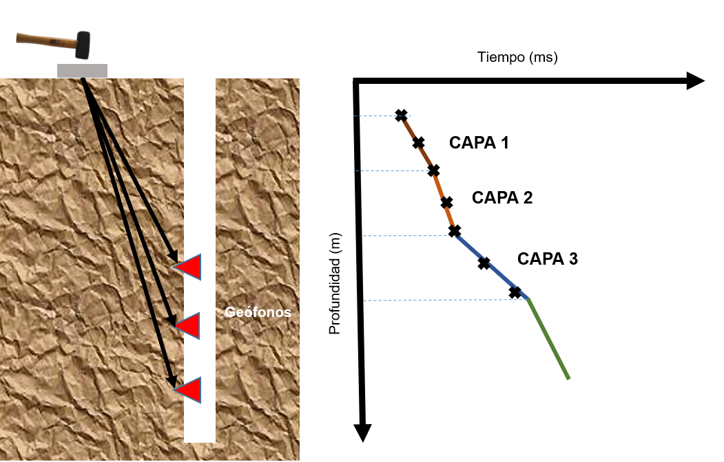 El Método Downhole, es un método geofísico que consiste en generar ondas de cuerpo (P y S) en superficie y registrarlas en receptores (triaxiales) colocados a distintas profundidades en un pozo en estudio. A partir de las primeras llegadas de las ondas, se puede generar un modelo de velocidades interválicas, tanto para las ondas P y S, en el área de estudio. Junto con la densidad, los resultados del downhole sirven para calcular los módulos dinámicos de deformación del terreno.