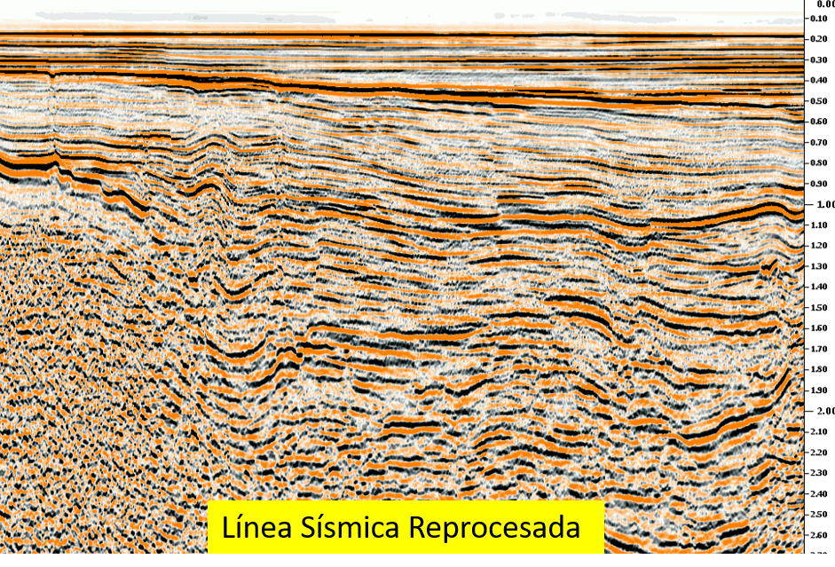 Figura 01. En la Figura se observa como con el reproceso de la línea sísmica, se mejora la continuidad de los reflectores, asimismo, algunos falsos eventos que se ven en la línea procesada, ya no se ven en la línea reprocesada.